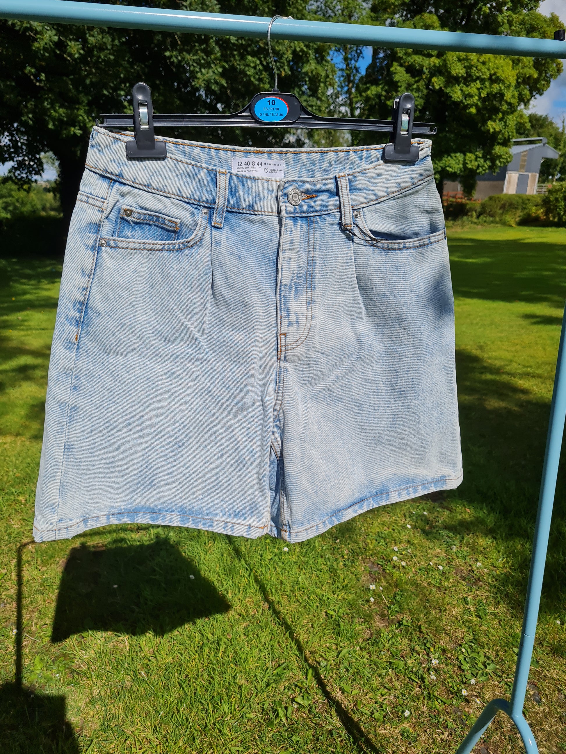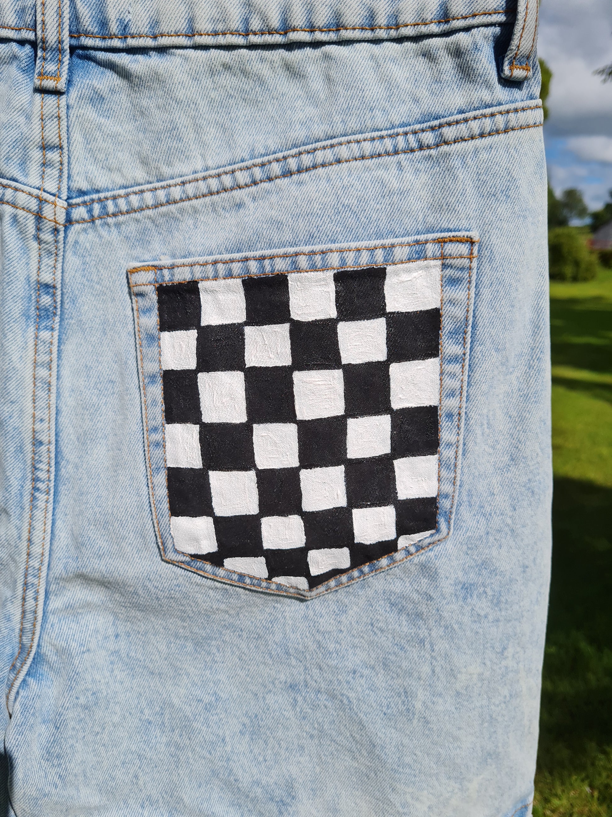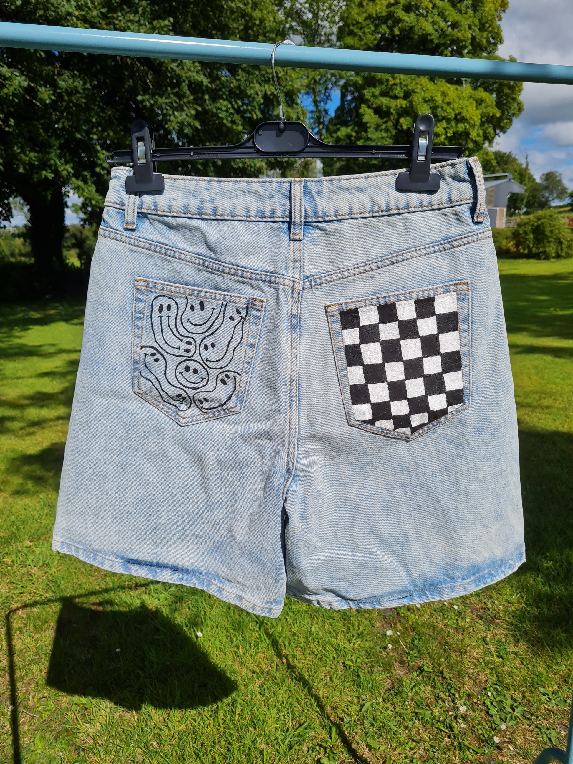 Denim shorts with black and white checks on one back pocket and black smiley faces on the other